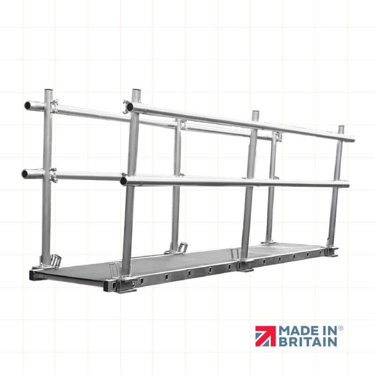 The 450mm wide Sterk Systems aluminium lightweight staging board has handrails for safe work at height. Plywood decking and a mesh covering are used in the construction to ensure maximum durability and grip when it was required. An incorporated lip on the stiles supports the lightweight aluminium staging board decking the entire length of the Sterk Systems staging board, and rubber inserts on the underneath limit instability when the Sterks Systems staging board is in use.